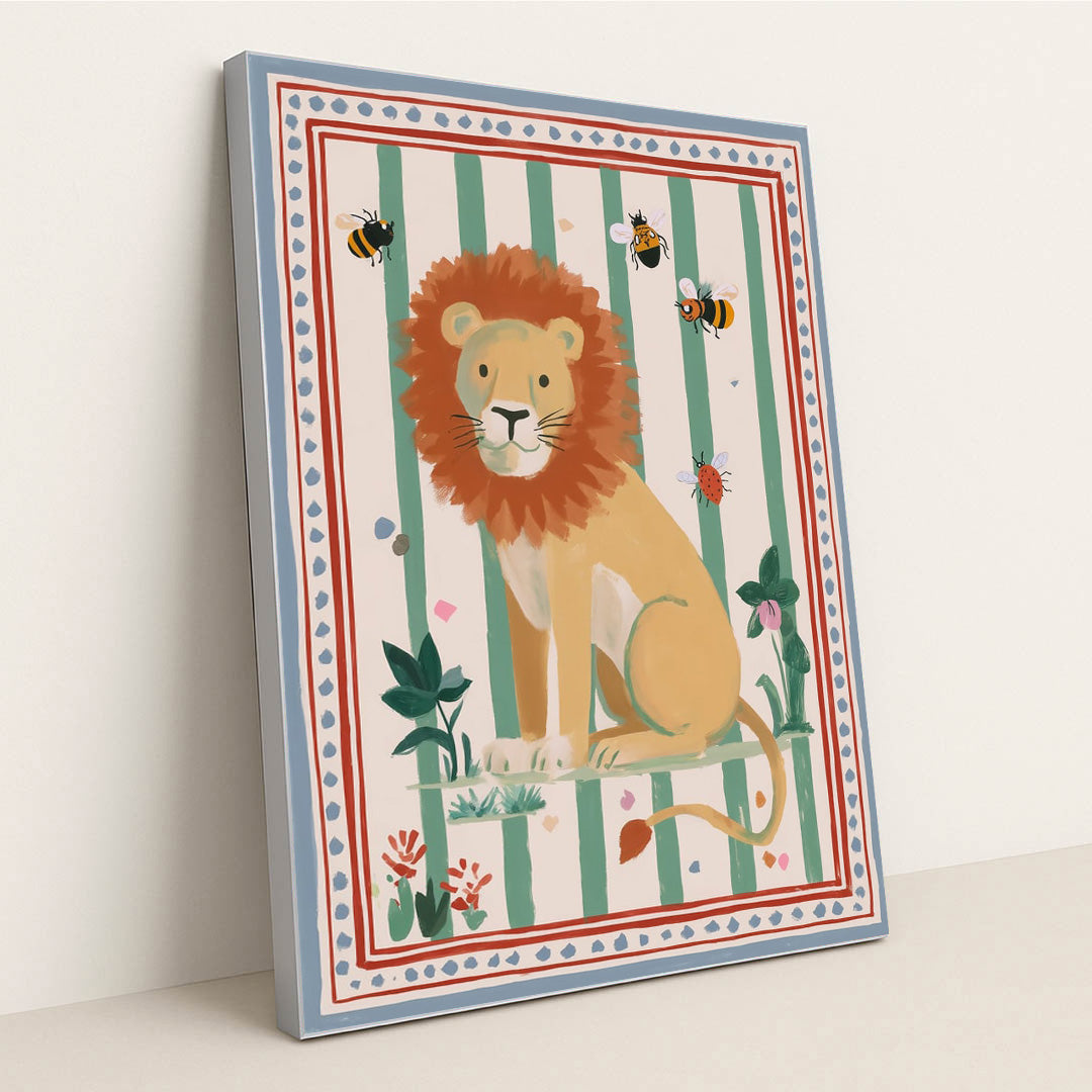 This charming illustration features a stately, yet friendly, lion sitting calmly amidst stylized jungle foliage against a backdrop of soft green and cream vertical stripes. The scene is playfully accented by oversized bees and insects. The folk-art-inspired borders and warm, earthy color palette give the piece a cozy, textile-like texture. This gentle, regal creature and its whimsical setting make this an inviting and sophisticated piece of nursery or kids' room art.