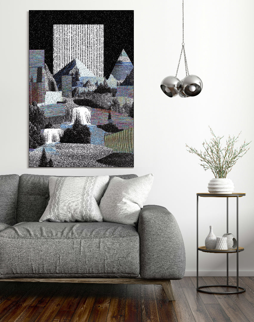 A serene cascade fractured by digital noise where waterfalls flow through corrupted geometry and reality bends toward the virtual.