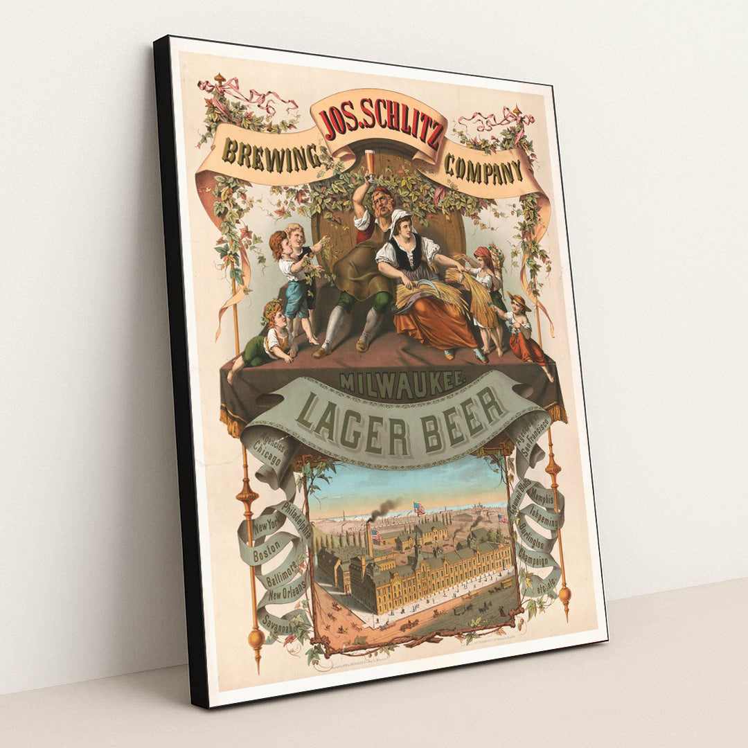 Step into the vibrant world of 19th-century advertising with Moritz Ulffers' captivating lithograph, "Jos. Schlitz Brewing Company, Milwaukee Lager Beer" (1878). This striking artwork embodies the spirited essence of the era, showcasing the artistry behind marketing as it celebrates the beloved Schlitz brand. Rich hues and intricate details draw the eye, reflecting the craftsmanship of both the brewing process and the print medium. A delightful blend of nostalgia and artistry, this piece invites art enthusiasts and collectors alike to appreciate its historical significance, making it a perfect addition to any collection that cherishes the intersection of art and commerce.