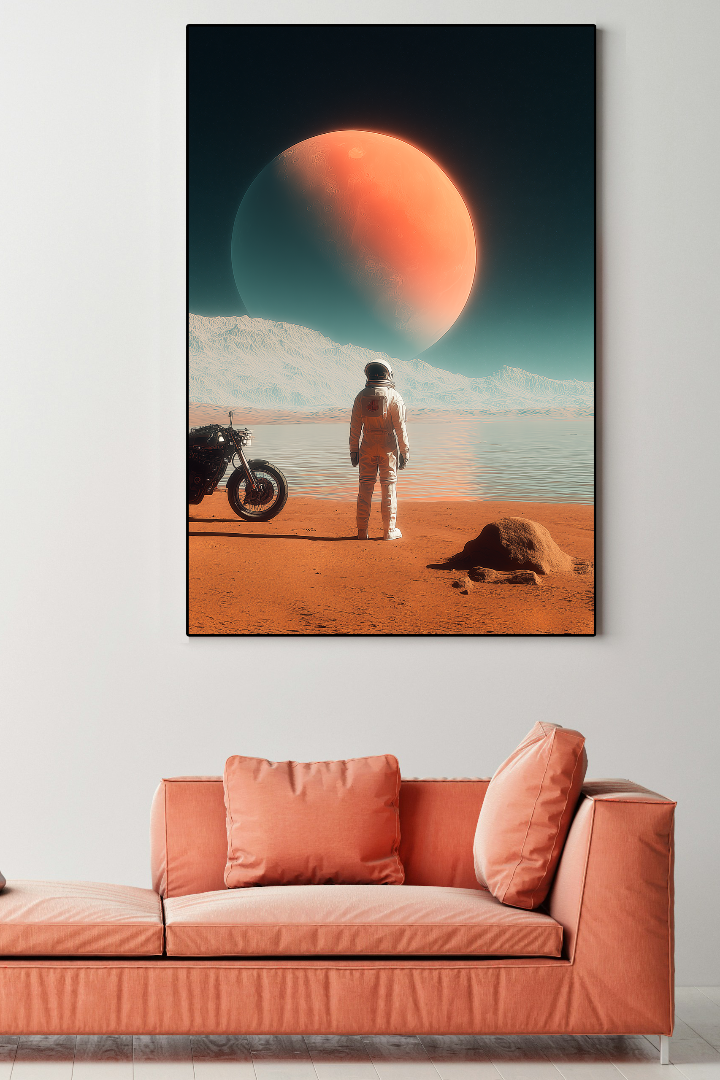A lone astronaut and a vintage motorcycle rest on Martian soil, gazing at a silent alien sea.
