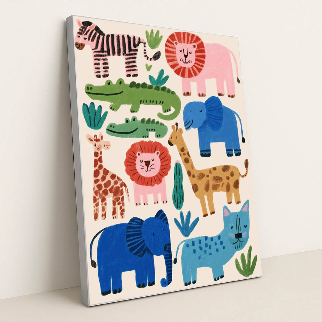 A colorful collection of friendly animals—giraffes, elephants, lions, crocodiles, and zebras—fills the page with charm and energy. The soft crayon-style texture and bright palette make the illustration feel cheerful and handmade.