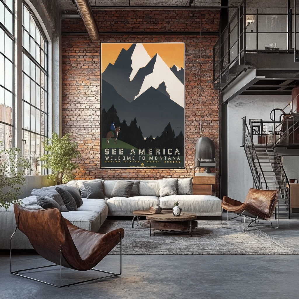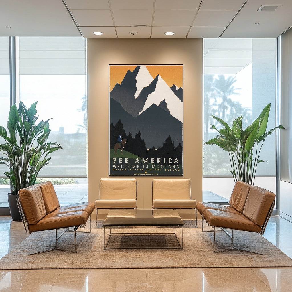 'See America. Welcome to Montana' (1936) by Martin Weitzman is a striking example of Art Deco's vibrant aesthetic, inviting viewers to explore the breathtaking landscapes of Montana. With its bold colors and stylized forms, Weitzman captures the essence of the American West, showcasing iconic imagery of soaring mountains and expansive skies. The artwork exudes a sense of adventure and patriotism, encouraging travel and appreciation of natural beauty. This piece not only reflects the optimism of the era but also serves as a timeless reminder of the allure of the American landscape, making it a must-have for art enthusiasts and collectors alike.