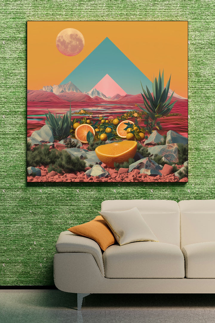 Bathed in the glow of a surreal sunset and crowned by dual pyramids, Solar Bloom reimagines the desert as a vibrant cradle of life. Juicy citrus, thriving greenery, and crystalline stones emerge from Mars-red soil under a golden sky, where moons rise and mountains watch silently. It’s a psychedelic nod to abundance in barren places — a perfect harmony of nature, geometry, and imagination. A must-have print for lovers of bold color, dreamy surrealism, and far-out landscapes.