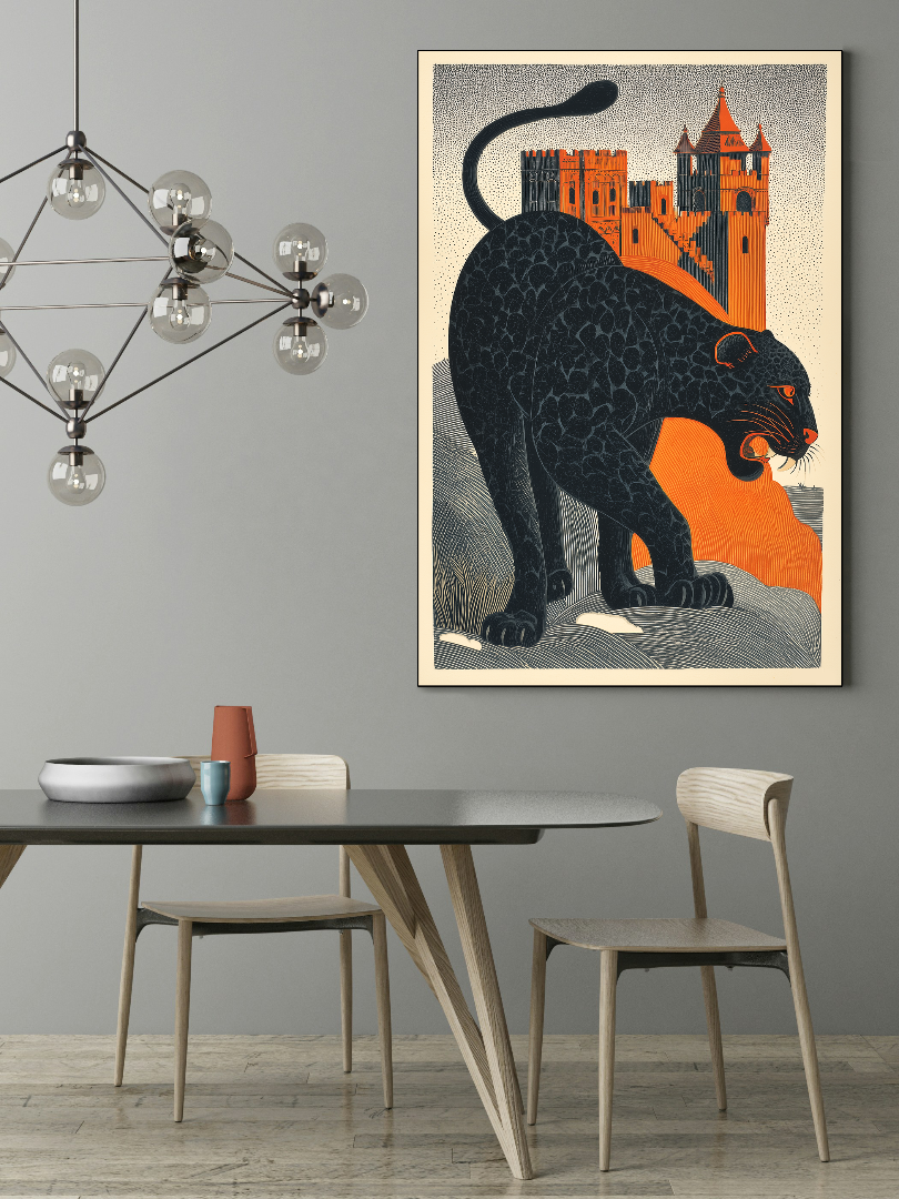 A watchful panther prowls beneath a glowing castle, blurring the line between protector and predator in this haunting fairytale of instinct and myth.