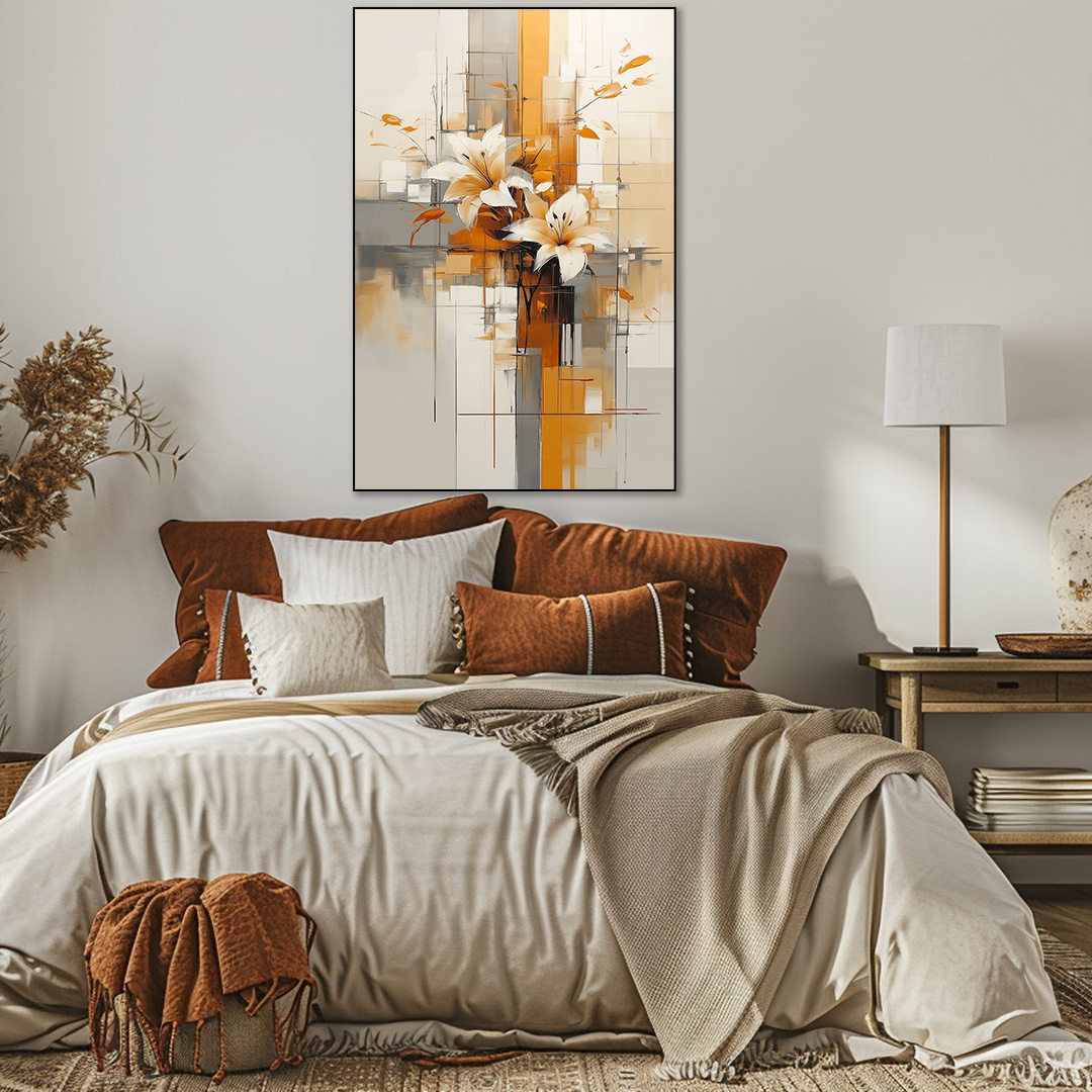 This is a vertical abstract painting featuring two prominent white and yellow lily blossoms. The style blends gestural, painterly strokes with a sharp, geometric background. The lilies themselves are rendered with soft, flowing brushwork, creating a sense of natural grace. In contrast, the backdrop is a grid of muted gray and warm ochre rectangles, giving the piece a modern, architectural feel. Splashes of orange and brown paint are scattered across the canvas, suggesting fallen petals or leaves. Black and deep red lines slice through the composition, adding a touch of bold, graphic energy and further emphasizing the contrast between the organic subject and its structured environment. The overall impression is one of harmonious juxtaposition, blending the beauty of nature with the clean lines of a cityscape.