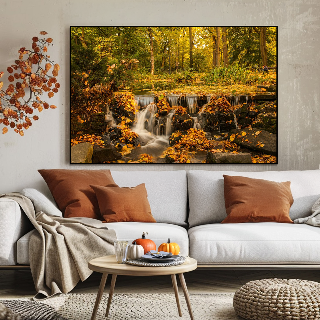 A hidden waterfall tumbles through golden leaves, inviting quiet reflection amidst autumn’s glow.